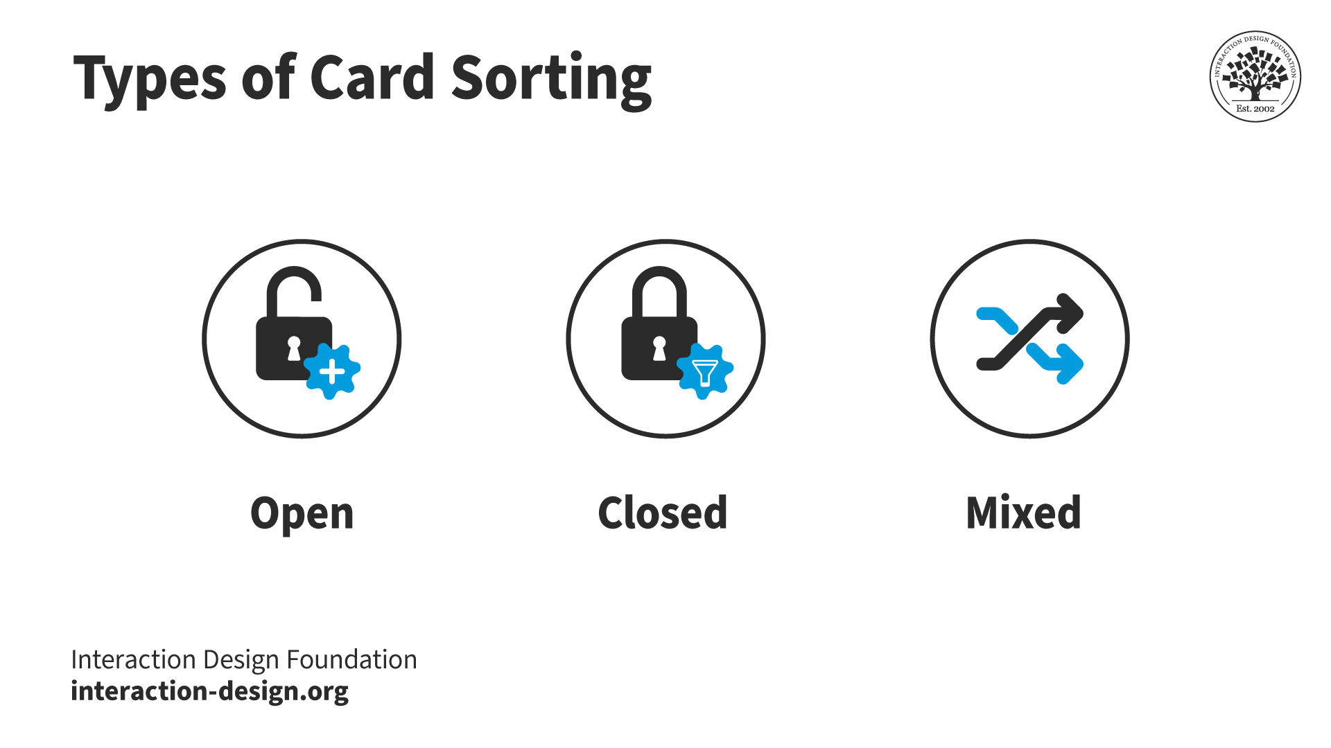 Depending on your project goals, development stage, and the information you want, you can choose between open, closed, or hybrid card sorting.