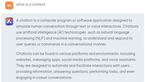 Opera's Aria AI-based chatbot describing what a chatbot is.
