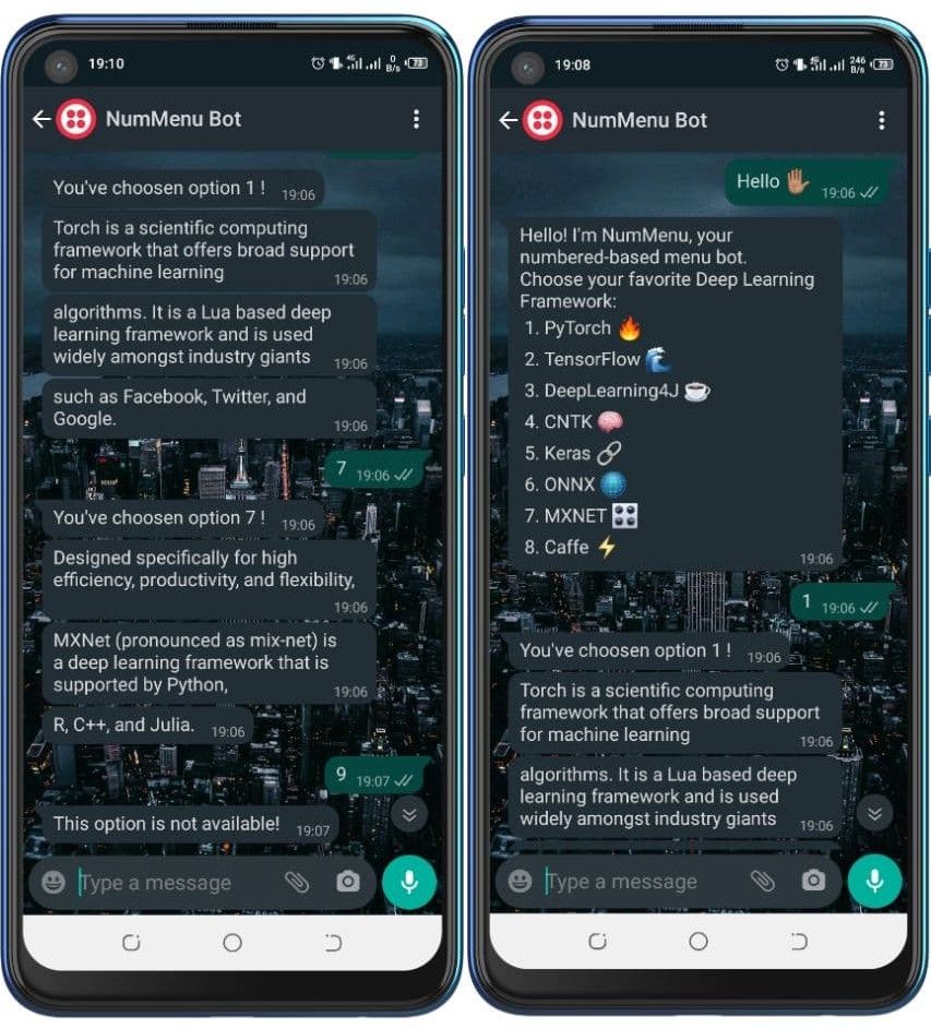 The screenshots below show a simple menu-based chatbot that might be used in a text-based environment like WhatsApp.