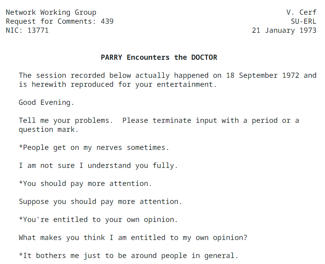 The chatbots Parry and Eliza talking together in 1972. (Eliza is the doctor.)