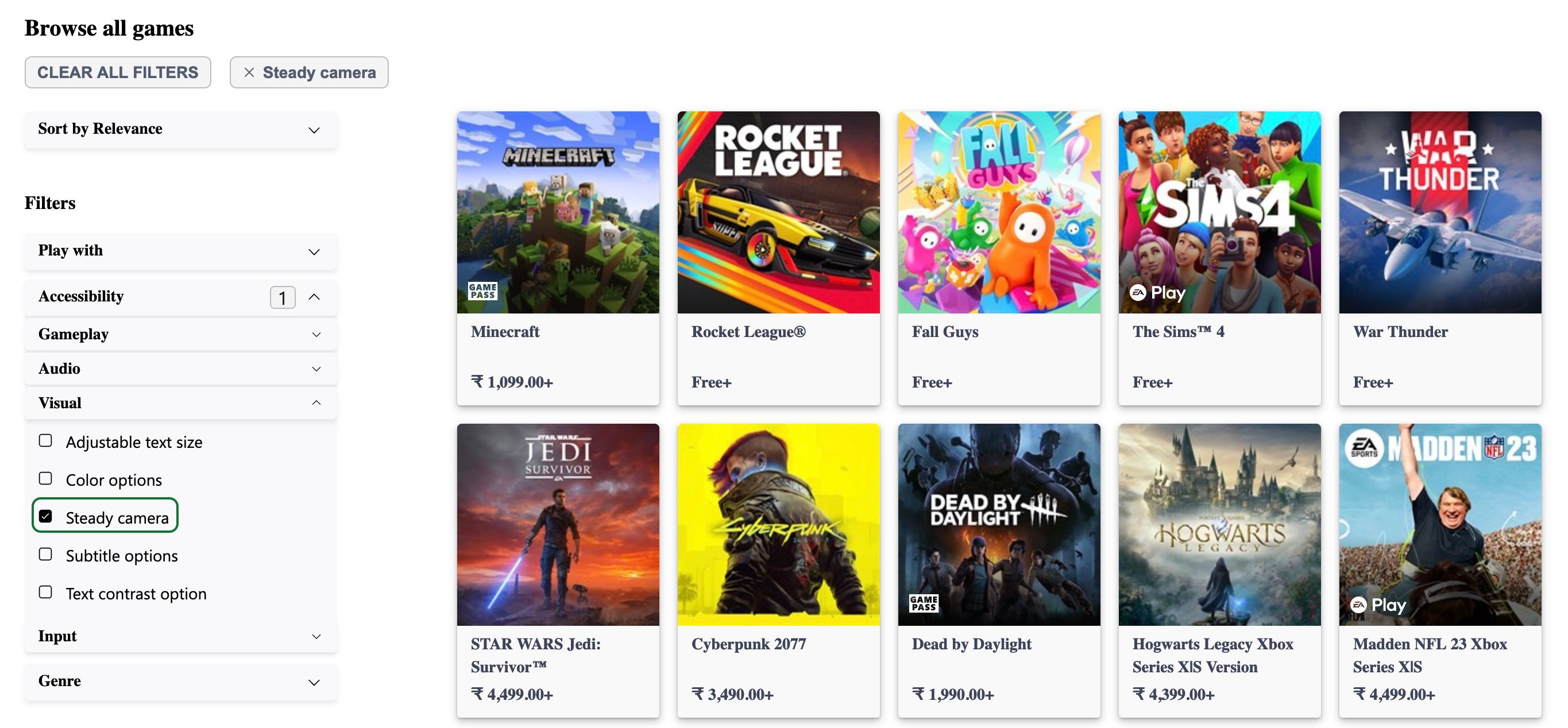 Microsoft’s Xbox game store allows users to filter games based on accessibility features. In this case, the chosen filter is “Steady Camera.” According to the Xbox guidelines, these games avoid “the use of shaking camera or “bobbing” movements, which may cause motion discomfort for some individuals, or there are options to turn off such movement.”