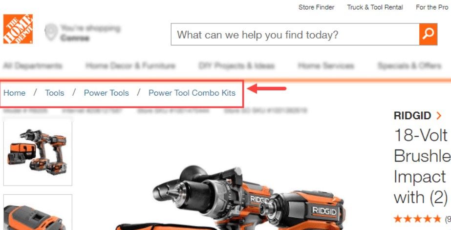 Websites like Home Depot use breadcrumbs in their product navigation, allowing users to track their path from home to the current page and easily return to a previous section.