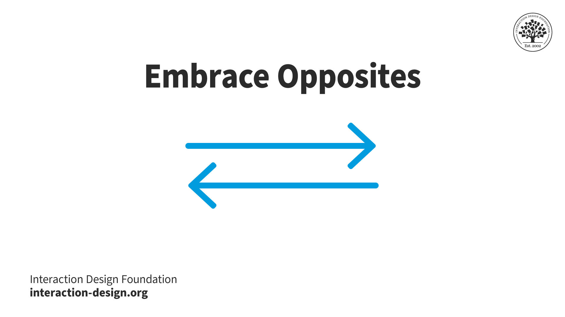 Embrace opposites is a convergent ideation method which designers use to explore their design space by finding overlaps between different categories or opposites. When they chart and compare two apparent opposites, they might find features that are common to both—and ones that are not—and spot new design opportunities.