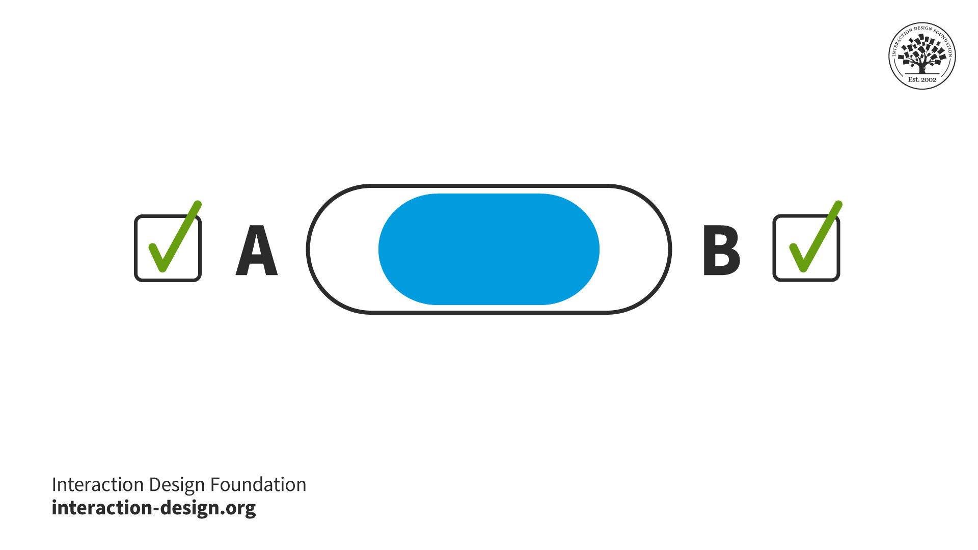 If A is “Off” and B is “On”, these are categorical distinctions. However, if A and B were other items that were opposed or distinct (e.g., menus and radio buttons), you might see them in dimensional terms, instead, and ask if they share features. Also, you might be able to design for a combination of these, perhaps with more of one than the other: