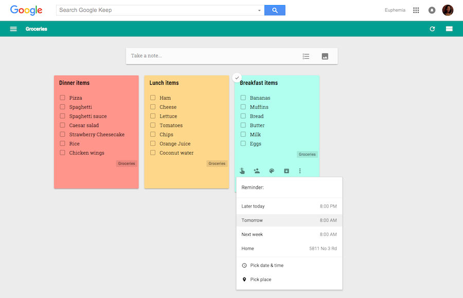 In Google Keep, the user can makes several grocery lists and sets a reminder for when to go get groceries. It’s a great example of how annotations and cognitive tracing helps free up your user’s time and head space.