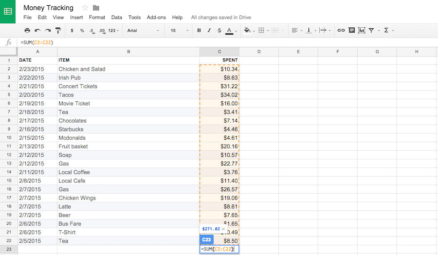 With the help of the calculator functions within Google Sheets, the user is able to calculate their monthly spending by looking at the total sum of item costs.