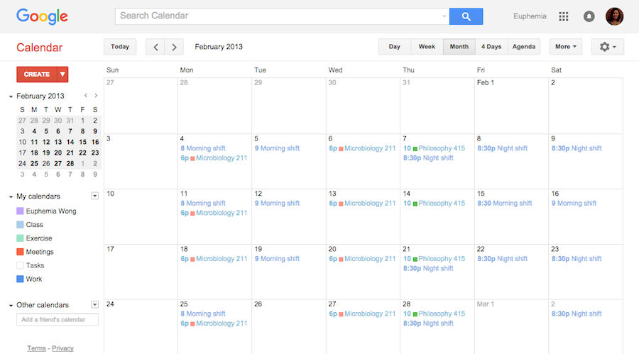The Google Calendar’s coloring code helps the user easily differentiate between different events like school classes, meetings and hobbies..