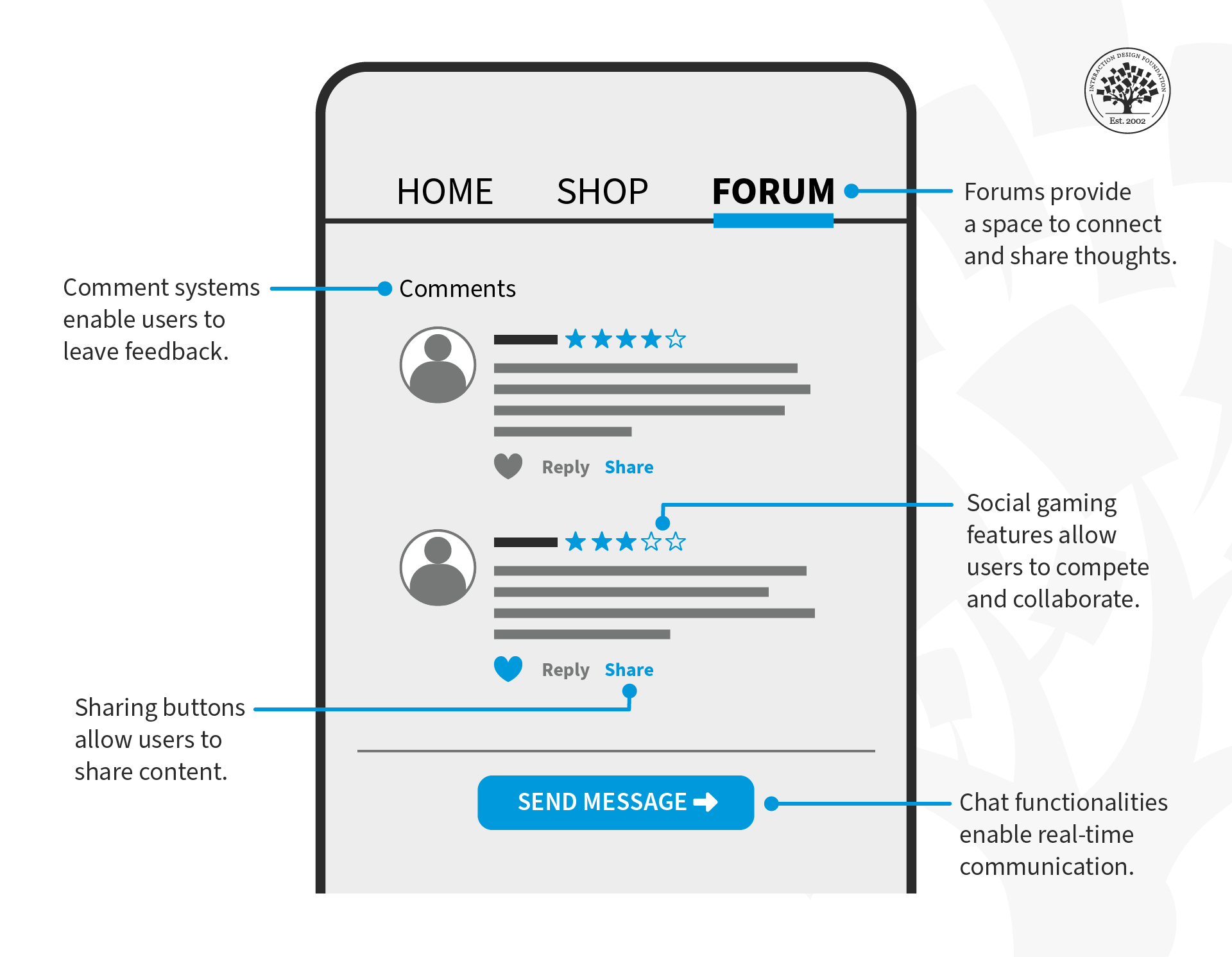 Here are some examples of features that UX designers can incorporate into their designs to promote social interaction: