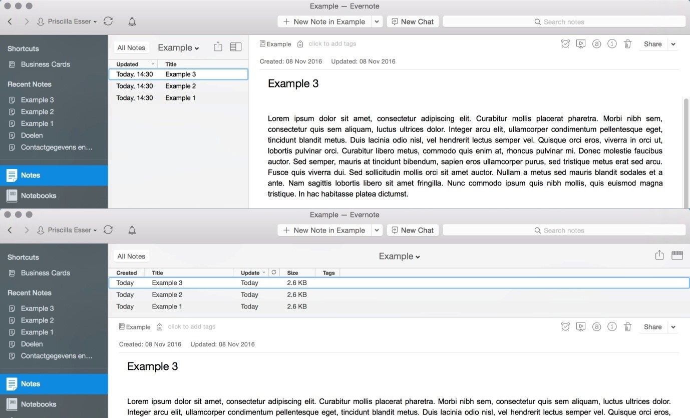 Users in the Western world tend to look from left to right and top to bottom, so when you design for those users the list should be placed either above or to the left of the panel in which the selected item contents are displayed. Evernote offers users a choice between these (and other) types of views for the two-panel selector.